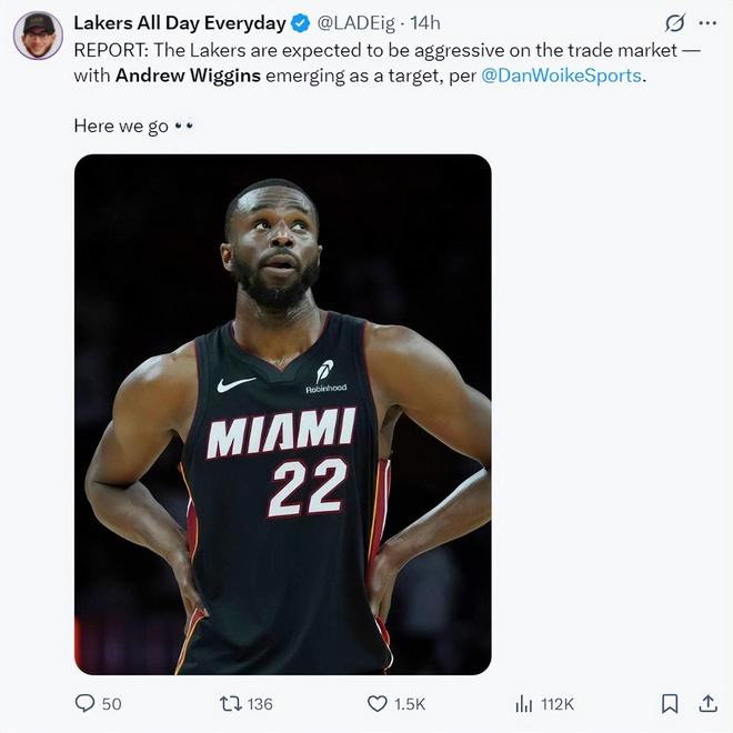北京时间9月12日,名记马克·斯坦提到洛杉矶湖人的潜在引援人选:迈阿密热火的侧翼安德鲁·维金斯。斯坦表示:“30岁的维金斯下赛季年薪2820万美元,2026-27赛季为球员选项,价值3020